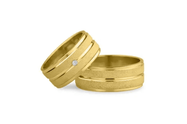 - Optați pentru verighetele aur galben late de 8 mm sablate cu linii lucioase pentru a sublinia eleganța și strălucirea relației voastre deosebite.